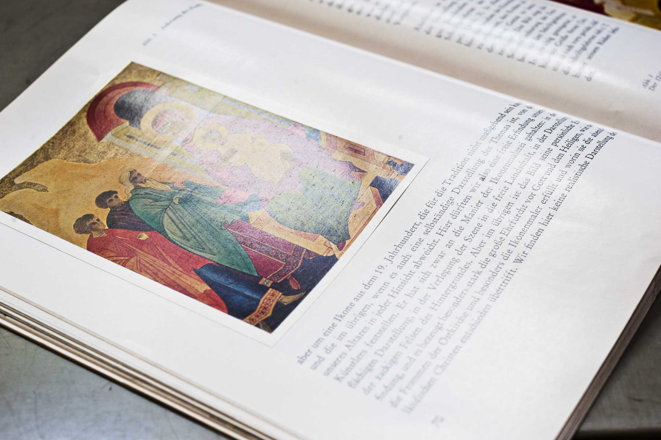 Im Verlag waren für die Textgestaltung ausgebildete Schriftsetzer zuständig, die an computerähnlichen Satzanlagen arbeiteten. Als Ergebnis kamen Textstreifen auf Film zustande, die auf dem Leuchtpult zusammen mit den von der „Lithoanstalt“ gelieferten Abbildungen zu Seiten auf Bögen zusammenmontiert (geklebt) wurden. Farbabbildungen wurden seit den späten 1970er Jahren nicht mehr rein fotomechanisch-/chemisch reproduziert, sondern von externen Spezialisten mit millionenteuren Trommelscannern gescannt. Ein deutlicher Qua­litätssprung, der bei alte und neue kunst 1983/84 sichtbar wird. Freilich hatte der Layouter noch wenig Spielraum. Die Bilder wurden nicht als Daten gespeichert, sondern beim Scannen zeitgleich als Filme ausgegeben, und so mussten sehr frühzeitig die endgültige Bildreihenfolge und die absoluten Abbildungsgrößen festgelegt werden. Ein planerischer Blindflug mit ­hohem Abstrak­tionsverlangen!